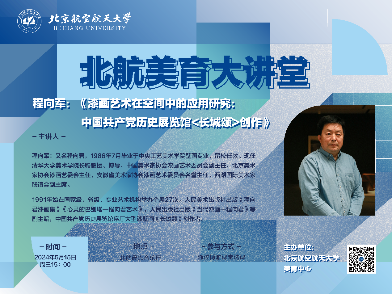 中国共产党历史展览馆序厅的巨幅漆壁画《长城颂》宽40米,高15米,总面积600平方米,由100块漆板组成,是史上最大的室内漆壁画,寓意建党百年。由清华大学美术学院程向军教授设计创作,获得2020-2021年度建筑材料应用创新类大奖。创作团队运用有效的工艺处理,使漆材料肌理与哑光工艺处理达到了理想视觉效果,观众可以无盲区地欣赏壁画,这幅世界上最大的漆壁画已经成为这座红色新地标的艺术名片。讲座通过中国共产党历史展览馆《长城颂》创作,讲述漆画艺术在空间中的应用研究。
