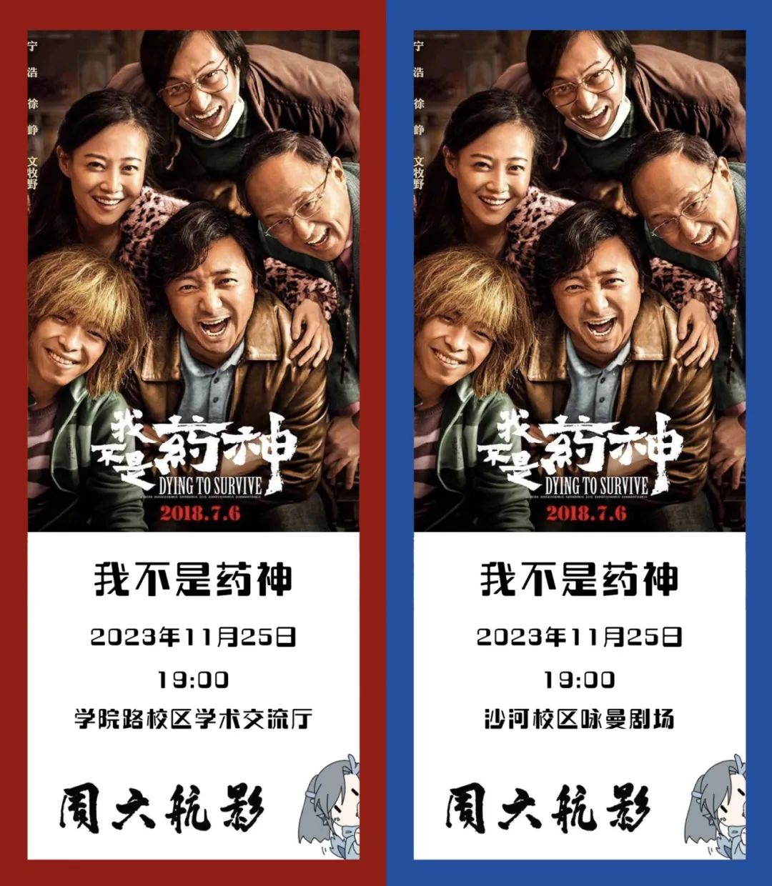 11月25日(周六)19:00,《我不是药神》将于学院路校区学术交流厅和沙河校区咏曼剧场同步放映。