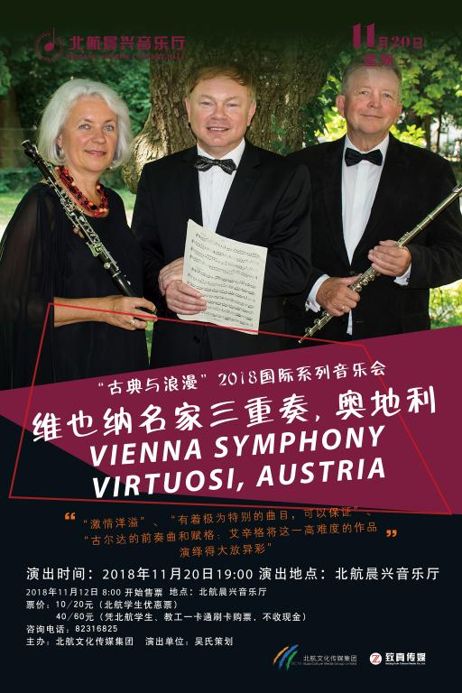 奥地利维也纳交响名家三重奏至今已成立35年,曾在众多场馆举办过室内乐音乐会。这一杰出的室内乐组合所演绎的作品旨在凸显维也纳音乐及其特有音色,其曲目不仅涵括巴洛克和古典音乐作品,还包括了当代音乐和爵士乐。该三重奏在维也纳曾举办过一系列广受好评的音乐会,还曾多次巡演全球,其足迹遍及欧洲、美国、中国、南非、中东、加拿大等。此外,他们还参加过奥地利布雷根茨艺术节、克恩顿之夏音乐节、林茨布鲁克纳音乐厅、维也纳音乐节、海顿艾森斯塔特音乐节、米尔施塔特音乐节、圣保罗文化之夏音乐节、格蒙登音乐节、因斯布鲁克音乐节等,还曾录制过大量CD,并参加过电台和电视节目。
