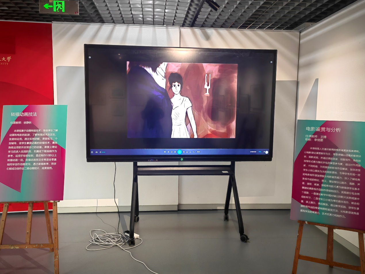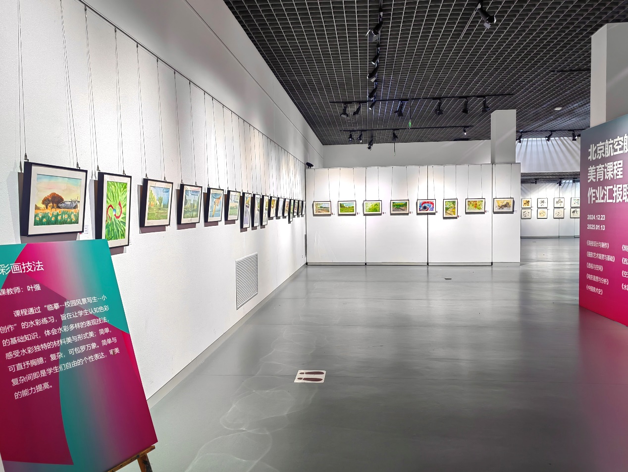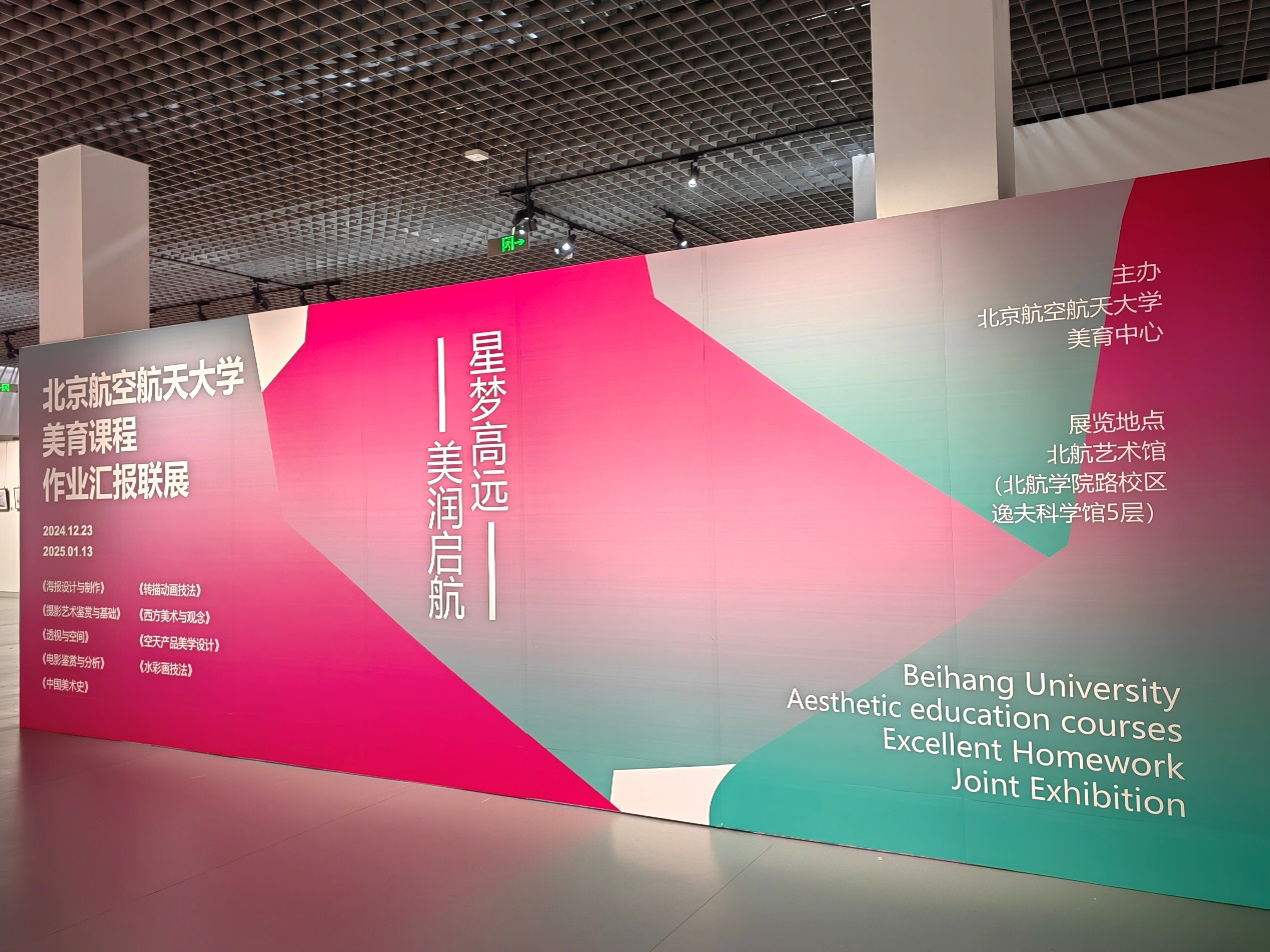 本次联展以“星梦高远,美润启航”为主题,包括《海报设计与制作》《摄影艺术鉴赏与基础》《透视与空间》《电影鉴赏与分析》《中国美术史》《转描动画技法》《西方美术与观念》《空天产品美学设计》《水彩画技法》等课程,包含绘画、海报、影像等类型作品,集中展示了二百余名学生的创作作品。