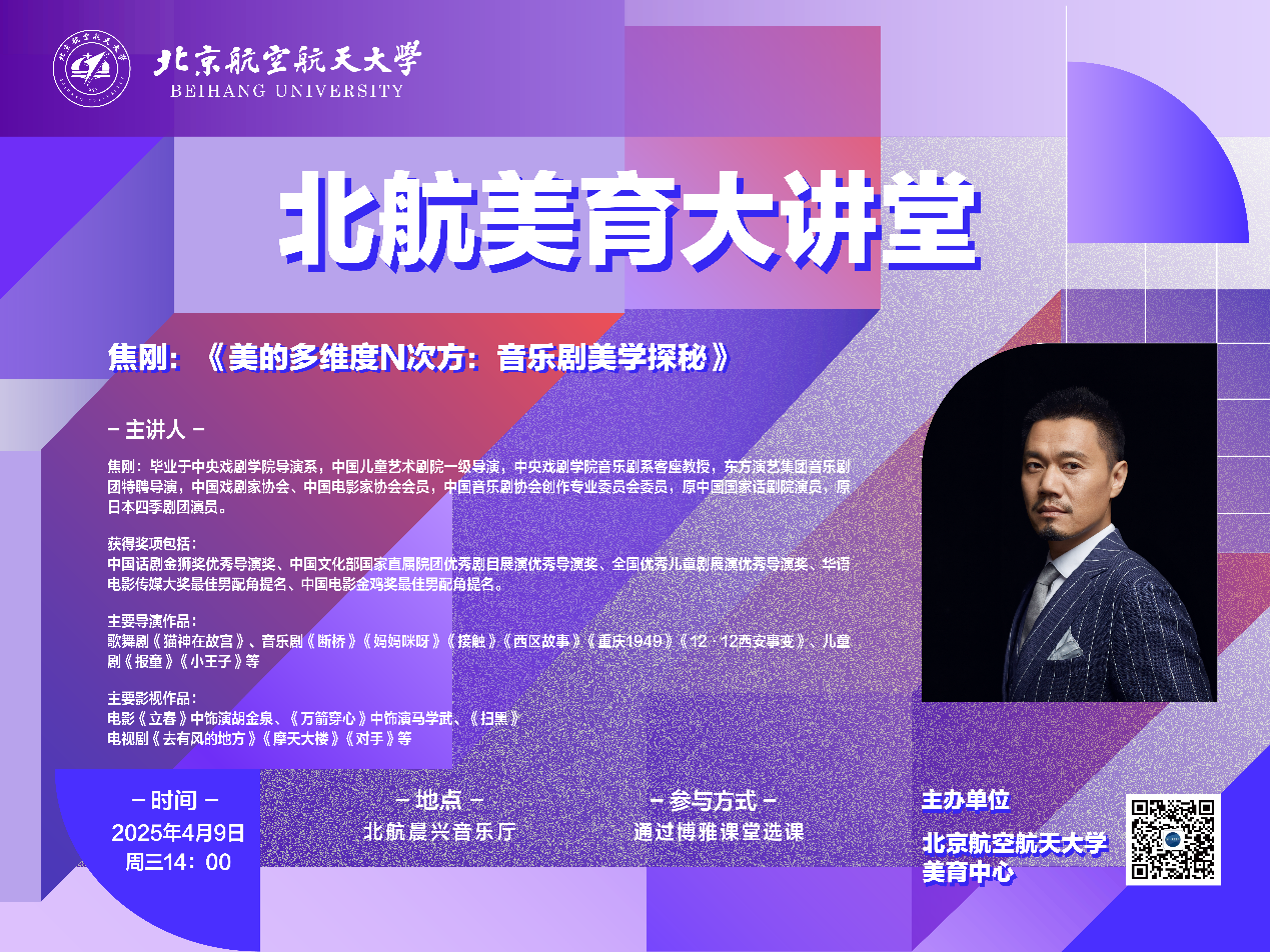 本次讲座焦刚导演将围绕音乐剧这一独特的艺术形式展开,以创作过程中的台前幕后“密事趣闻”为切入点,带领大家深入了解音乐剧背后的美学理念和艺术追求。音乐剧作为一种融合了音乐、舞蹈、戏剧和舞台艺术的综合性表演形式,具有独特的美学价值。它不仅在情感表达、叙事方式和角色塑造方面展现出丰富的层次,更在舞台视觉、灯光设计、服装造型等方面形成了别具一格的艺术风格。
