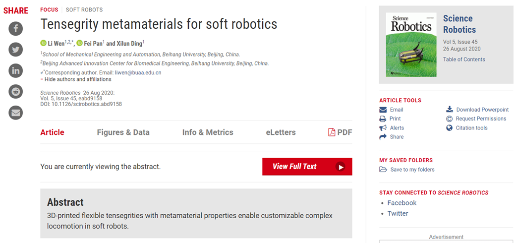 8月26日,《科学》杂志子刊《科学·机器人学》(Science Robotics)刊登了我校机械学院研究团队题为“Tensegrity metamaterials for soft robotics”的特邀评述论文(Focus article)。论文对张拉整体结构超材料软体机器人的最新研究进展进行了评述。机械学院文力教授为本文第一兼通讯作者,丁希仑教授与卓越百人博士后潘飞为本文的共同作者。