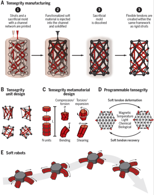 针对此问题,研究团队回顾并分析了传统的张拉整体结构,并着重介绍了Science Robotics近期报道的一种新的张拉整体结构加工方法。该方法可以快速完成磁性软材料和刚性杆件的一体化制造,并可用于加工具有压扭/拉扭、力学性能可编程等特性的张拉整体结构力学超材料,应用于软体机器人设计 ( https://doi.org/10.1126/scirobotics.aay9024)。基于这种超材料的软体机器人在磁场或电机驱动下可实现翻滚、定向爬行等多种运动模式。研究团队认为该一体化制造方法成功地将功能化软材料网络和孤立的刚性杆快速有效地集成在一起,为制造多尺度、多材料的可编程张拉整体结构提供了可行方法。
