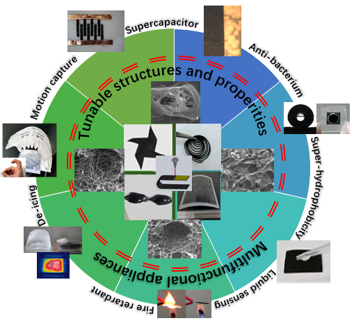 通过系统的加工结构性能关系探索研究,该先进激光诱导GP材料具备优异的力学、电学、热学、电化学等特性,可用于可穿戴手势识别、机器人动作捕捉、油水分离、抗菌界面以及实现具有阻燃、防/除冰、结构健康监测等功能的先进航空树脂基复合材料结构,未来具有广阔的商业化前景。