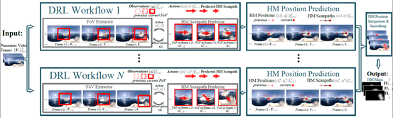 在对热点图分析后,团队发现,尽管不同的人观看同一内容时感知区域存在一定差异,但与视频内容依然具有强关联性。基于此,可构建预测模型,预测人类观看全景视频时的头动位置。而这种模型的构建机理,又与强化学习方法有本质上的联系。因此,他们提出一种新型的深度强化学习(DRL)模型,构建智能体模拟人类行为,预测人类观看全景视频时的头部运动。首次提出全景视频视场热点图的生成方法,可离线地预测全景视频视场,并提出一种全景视频的在线生成方法,可在线实时预测全景视频视场。最后,实验结果验证:与传统算法相比,论文提出的算法所预测视野热点图,CC(和真实结果的相关系数)精度提升超过20%。论文对全景视频的压缩,渲染,感知,有着广泛的应用场景,为提升全景视频用户体验提供了理论支撑。