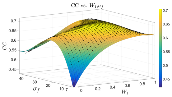图4.对中心偏见取不同标准差和权重系数下预测结果的CC值拟合曲面