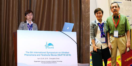 图:(左图)吴晓君副教授在第九届超快现象与太赫兹国际会议上展示最新成果 (右图)吴晓君副教授与倾斜波前技术的发明人Hebling教授的合影