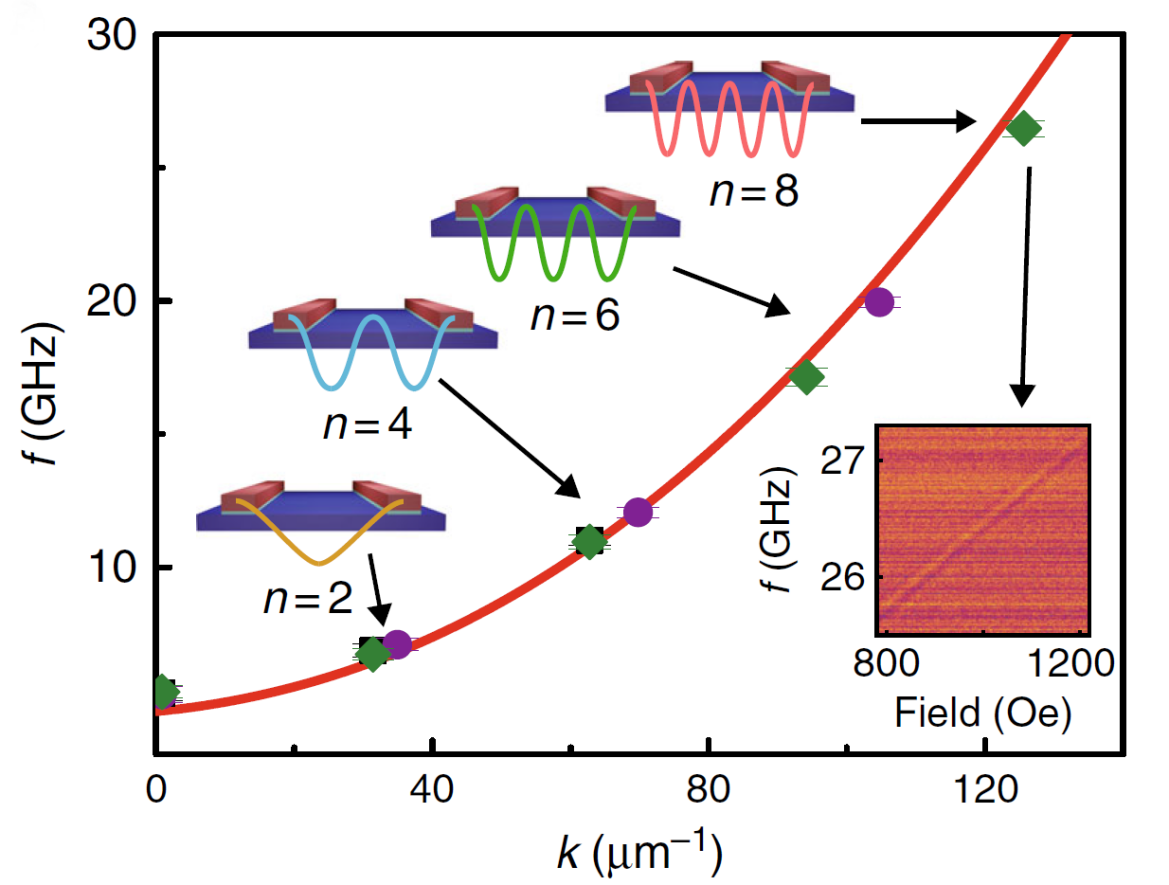 激发超短波长的自旋波能够减小器件尺寸,提高集成度,同时短波长对应着更高的频率,自旋逻辑器件也会有更快的运算速度。但想要激发出短波长自旋波可不容易,实验过程中所需测量的自旋波频率最高超过了30GHz,这已经接近目前测量系统的极限,为了获得令人信服的结果,于教授的团队通过长时间的校准和调试才得到了清晰的自旋波信号,为之后的进一步理论分析打下了可靠的基础。