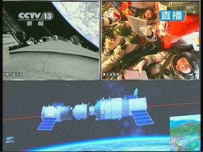 神舟九号飞船航天员刘旺操作飞船姿态控制手柄