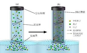 许亿博士的研究,目前已进展至能够利用EGD-PIII&D技术,在内径细至0.8mm、长超过100mm的石英毛细管的内壁沉积了DLC薄膜,并将该技术拓展至螺旋管、C形管等异形管内壁薄膜的沉积。此外,许亿博士针对管内壁DLC薄膜沉积过程中初始阶段注入电流快速增长的现象,研究了管内壁材料对等离子体放电的影响,揭示了自增强等离子体放电效应,又对管内壁涂层不均匀的问题设计了多项试验,最终掌握了管内壁DLC薄膜沉积过程中气体流量和电压大小对薄膜均匀性的影响规律。