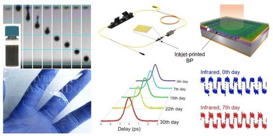 在黑磷喷墨打印技术的研究中,张梦老师及其课题组通过精确控制墨水化学成分并平衡其相互竞争的流体效应得到稳定的黑磷墨水,该墨水能高质量、高均匀性、高速地大规模打印新型功能性光电器件。采用该方法打印的黑磷应用到激光器中用作超快光开关,将激光器的连续光输出转变为超短脉冲序列,有利于该项技术在工业和医疗方面的推广应用。张梦老师表示:“相比于其它研究,我们使用打印黑磷设计的非线性光学器件显著提升了运转性能和稳定性。”